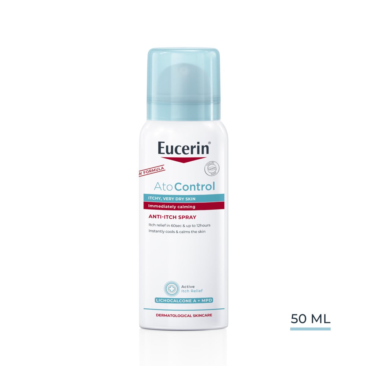 Eucerin AtoControl Anti-Itch-Spray -suihke ei ole lääkevalmiste, eikä sen ole tarkoitus korvata lääkehoitoa. Voit käyttää tuotetta lääkevoiteen rinnalla siten, että annat ensin lääkevoiteen imeytyä, jonka jälkeen voit käyttää Eucerin AtoControl -tuotteita.