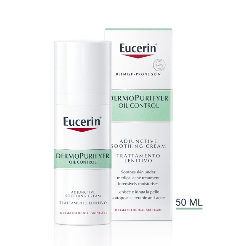 Eucerin DermoPurifyer Adjunctive Soothing Cream on kosteusvoide, joka on kehitetty erityisesti akneen taipuvaiselle iholle lääketieteellisen aknehoidon tueksi.