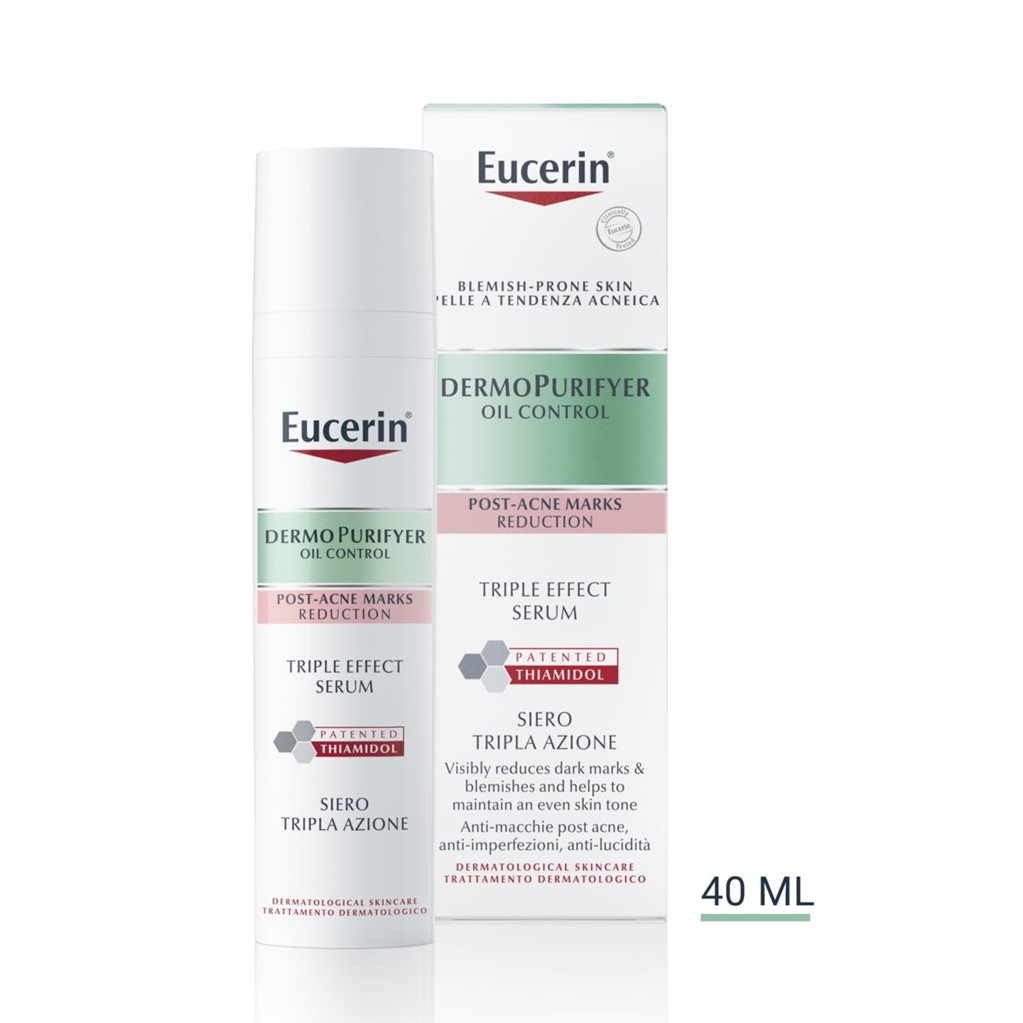 Eucerin DermoPurifyer Triple Effect Serum on seerumi, joka sisältää patentoitua Thiamidolia ja antaa mahdollisuuden päihittää epäpuhtaudet ja aknen jälkeiset jäljet kolmen avaintekijän avulla: