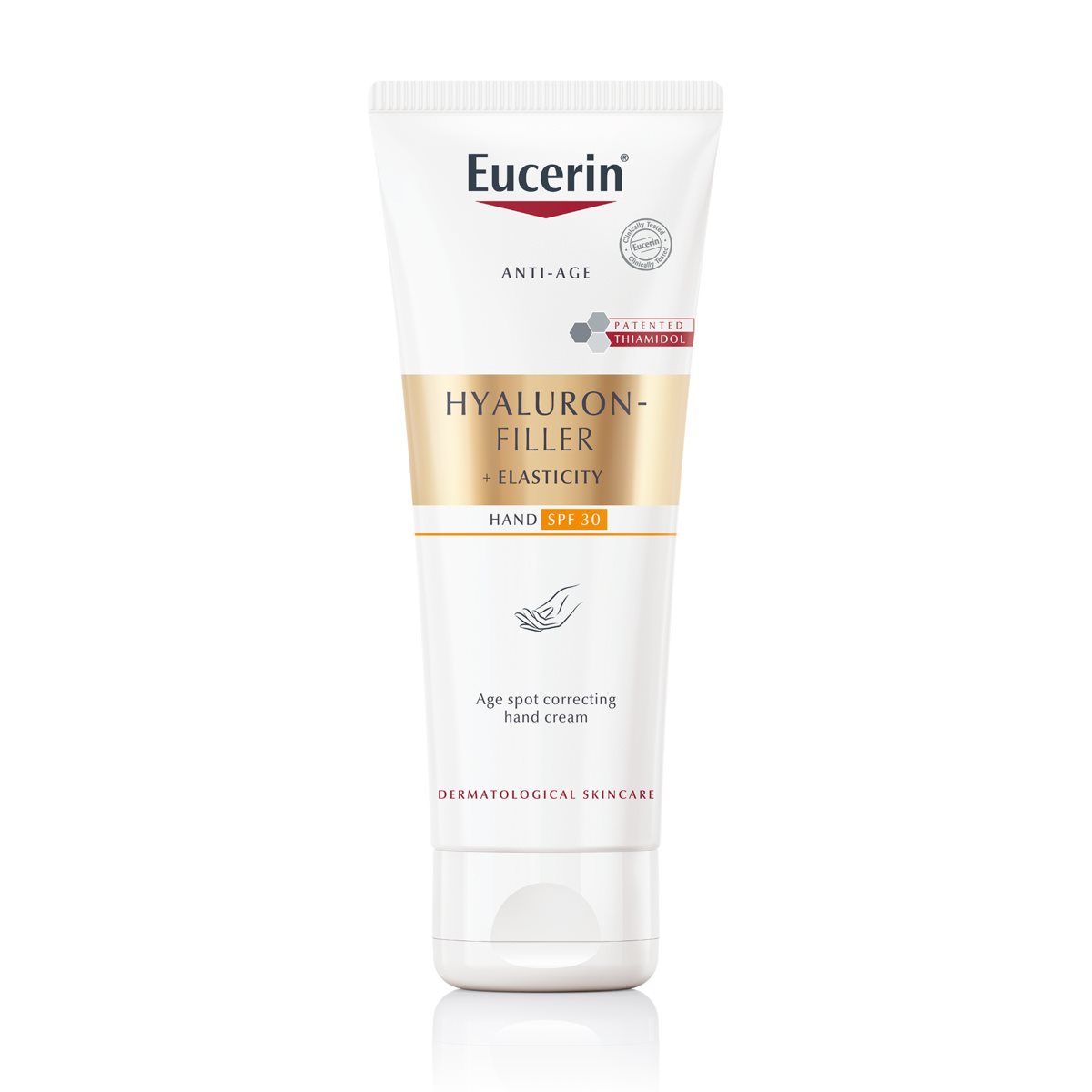Eucerin Hyaluron-Filler + Elasticity Age Spot Correcting Hand Cream -voiteen uniikki koostumus vaikuttaa monipuolisesti ikääntymisen merkkeihin käsien iholla. Eucerinin innovatiivinen yhdistelmä sekä suuri- että pienimolekyylistä hyaluronihappoa madaltaa näkyvästi jopa syviä ryppyjä. Arktiini stimuloi ihon omaa kollageenin tuotantoa. Voide sisältää myös Thiamidolia, tehokasta ja patentoitua ainesosaa, joka vaikuttaa suoraan pigmenttimuutosten syntymekanismiin. Sen on kliinisisssä ja dermatologisissa testeissä todistettu häivyttävän pigmenttimuutoksia iholla ja estävän niiden ilmaantumista. Säännöllisessä käytössä tuloksia on nähtävissä jo kahden viikon jälkeen – pidempään käytettynä tulokset ovat vielä näkyvämpiä.