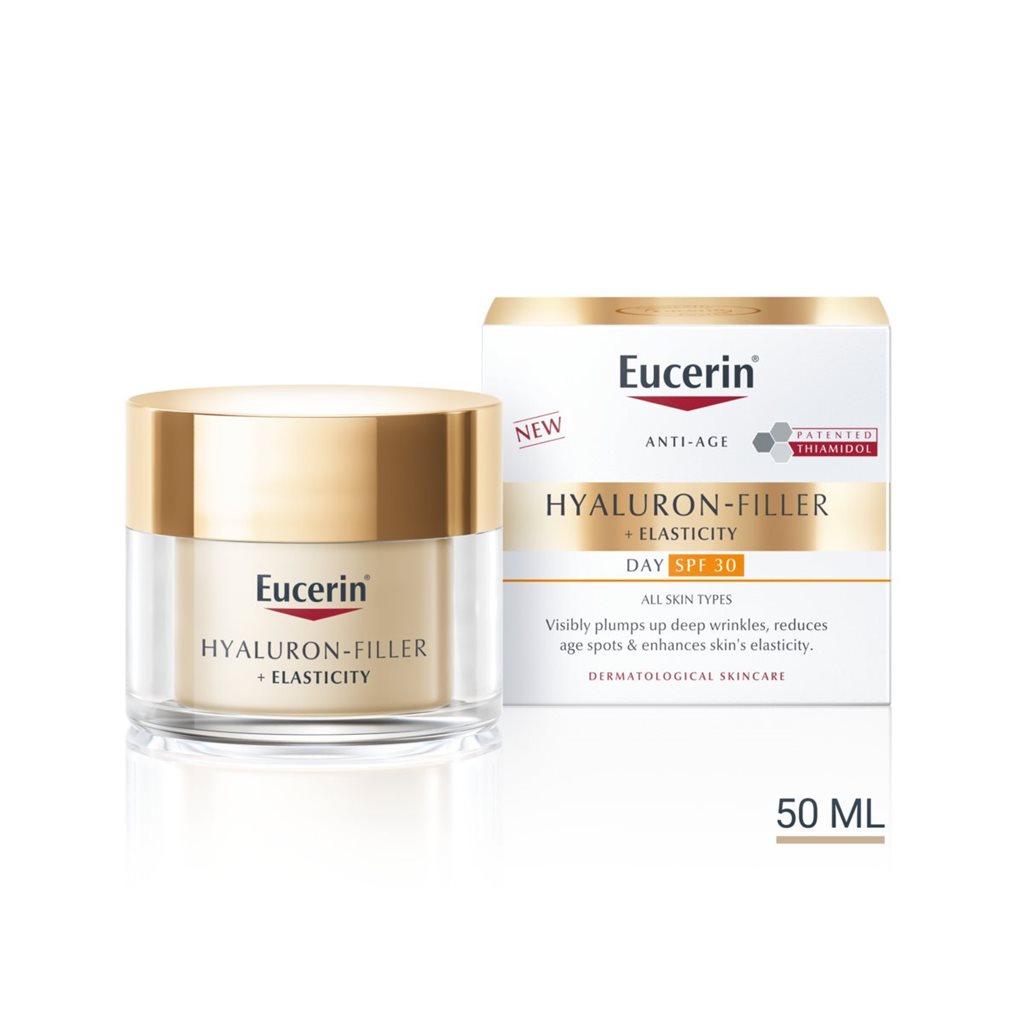 Eucerin Hyaluron-Filler + Elasticity Day SPF 30 on ihon ikääntymistä estävä päivävoide, joka silottaa jopa syviä ryppyjä ja parantaa ihon kimmoisuutta sekä vaalentaa ikääntymisestä johtuvia pigmenttimuutoksia eli maksaläiskiä. Ainutlaatuinen koostumus on kehitetty vastaamaan ikääntyvän ihon tarpeisiin. Eucerinin innovatiivinen yhdistelmä sekä suuri- että pienimolekyylistä hyaluronihappoa täyttää näkyvästi jopa syviä ryppyjä. Uusi Collagen-Elastin Complex, voimakas arktiinin ja kreatiinin yhdistelmä, tehostaa kollageenin tuotantoa ja lisää ihon kimmoisuutta. Eucerinin patentoima Thiamidol vähentää ikääntymisen merkkejä häivyttämällä pigmenttivaurioita. Tuloksena on iho, joka on sileämpi, heleämpi ja näkyvästi nuorekkaampi.