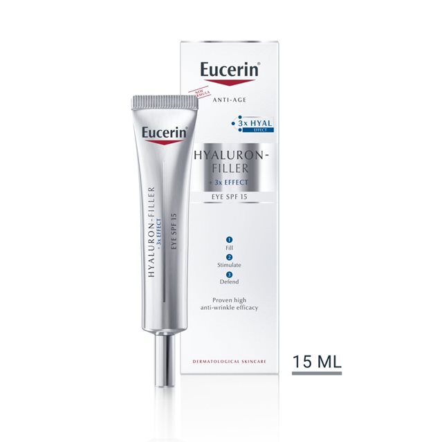 Eucerin Hyaluron-Filler Eye SPF15 sisältää myös glysiinisaponiinia, joka tukee hyaluronihapon tuotantoa dermiksen soluissa, jossa syvimmät rypyt syntyvät. Siksi Eucerin Hyaluron-Filler Eye SPF15 on todennäköisesti tehokkain hoitotuote silmänympärysihollesi, jos olet erityisesti huolissasi silmänympärysihon rypyistä.